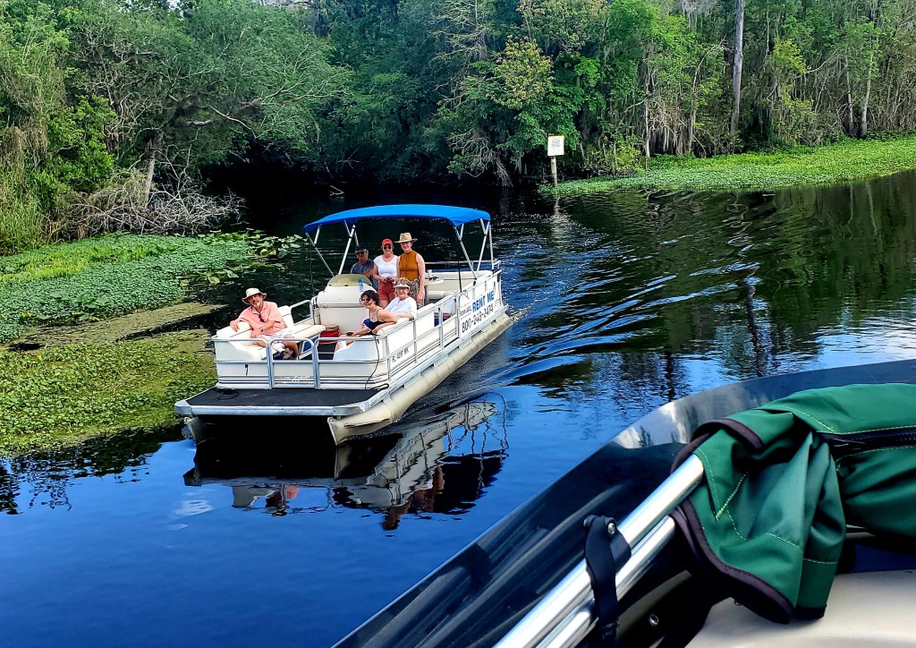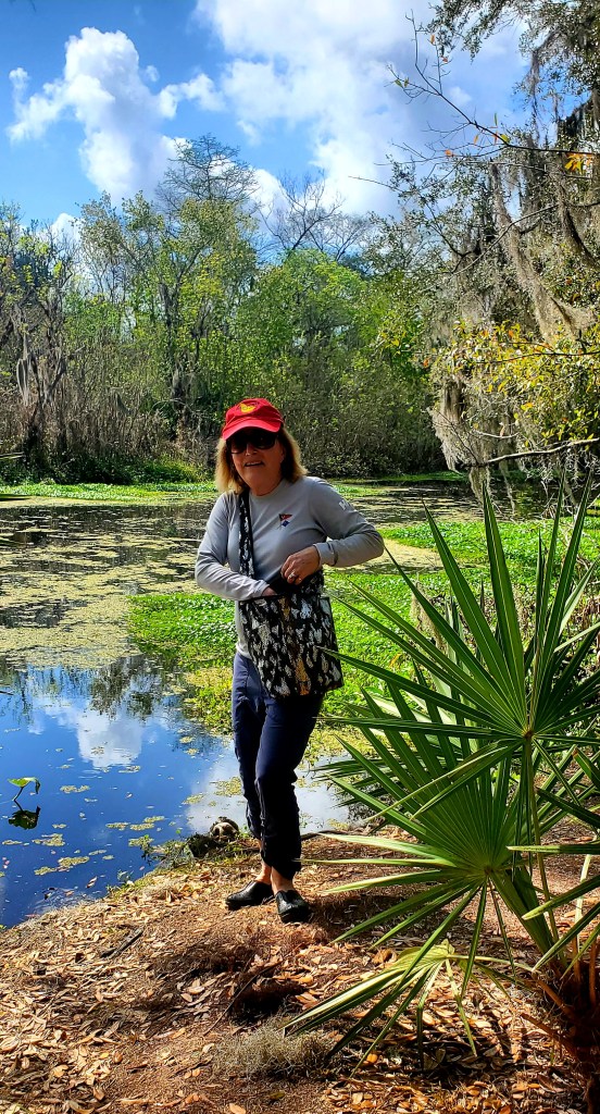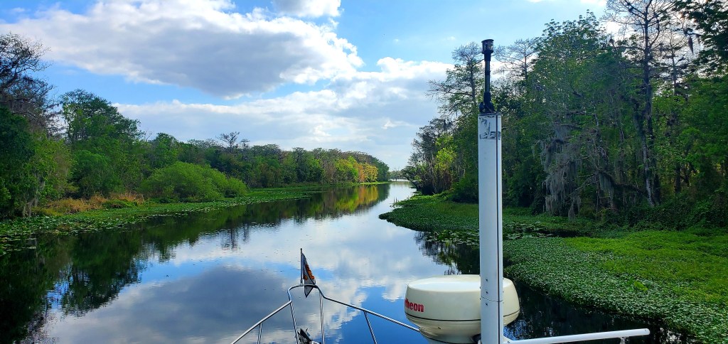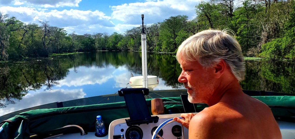 It was truly wonderful to share a full day with my friend June, who drove down with me, and with Jeff’s brother Buck and his wife Denise, who drove down from Michigan’s Upper Peninsula to explore Florida for a month. And to be under way again on Many Moons and take the helm for awhile – from the fly bridge! On a narrow river that felt like a mini-Amazon! Then a visit via boat to the famous Blue Spring. Photos and captions below.