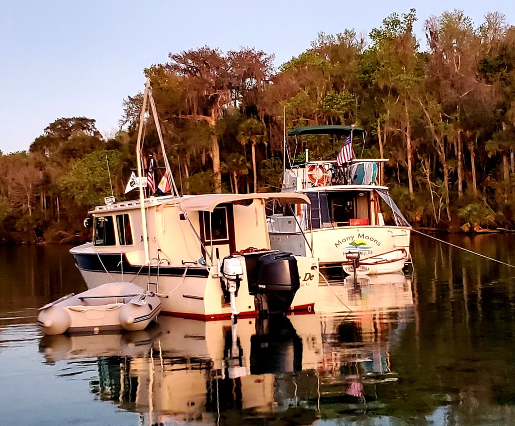 Hello again, DeDe! We said good-bye to Henry and Diane at Hontoon days ago. What a pleasant surprise to see them again here. Jeff took our little dinghy over to say “hi.”