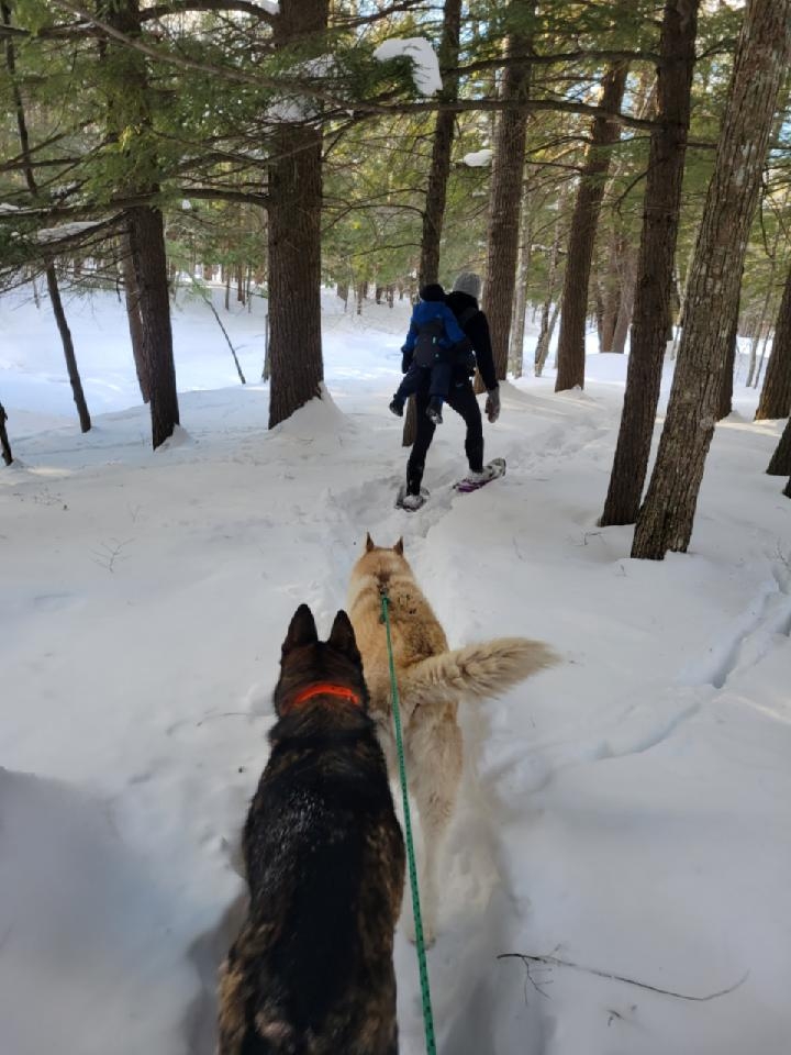Meanwhile, back in Michigan ….! That’s the Siberian Husky Roscoe on the right, who you’ve seen in my previous posts about Camp Many Moons. I’m his main playmate when I’m up north. He’s living with Jeff’s son, Josh, while we’re under way. That’s Josh on snowshoes, carrying his young son on his back. What a great way to introduce Jaxton to the great outdoors!