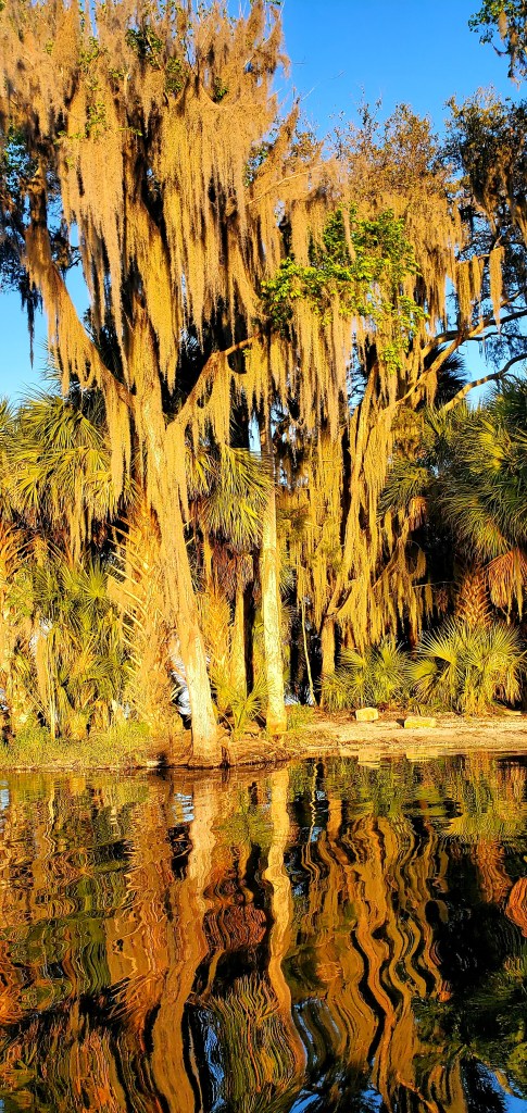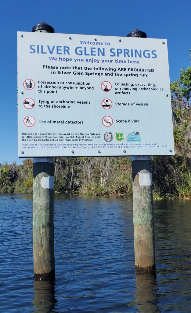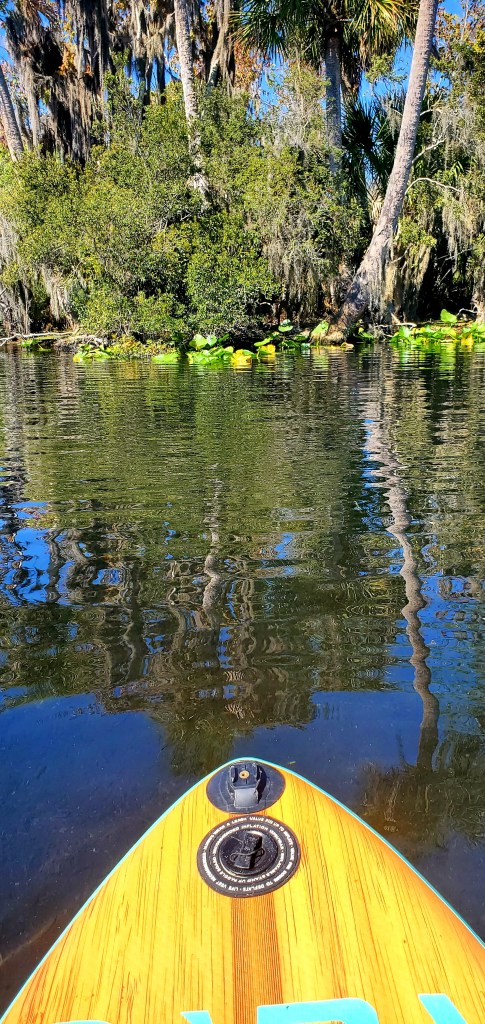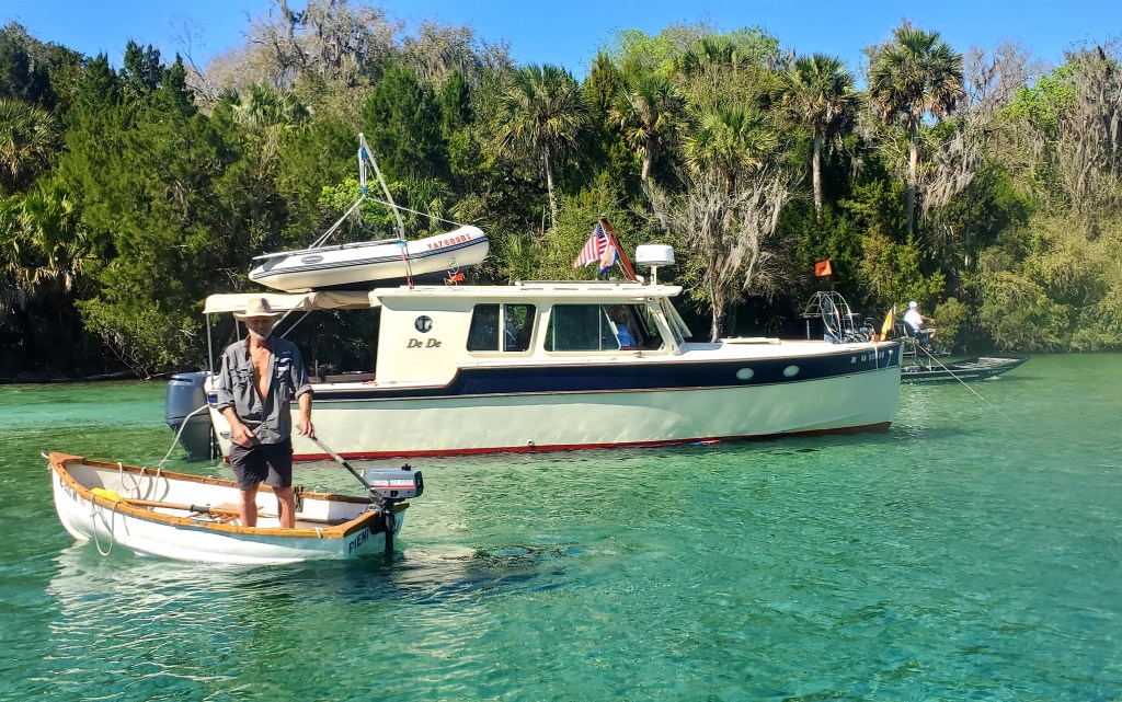 How fabulous to get into the water and actually swim, which I haven’t been able to do since Lake Michigan. (With mask and snorkel, the better to watch the plentiful turtles skipping along the seafloor, and the occasional big crab doing that sideways scoot.) And what a great location for the paddle board and dinghy! It’s also a peculiar place in some ways. A handful of rough boats have “set up camp” here, one or two tied to the shore – against regulations, but nobody seems to be monitoring – and on warm days, the place swarms with watercraft of all types, including air boats. Ar-r-gh. But mornings and evenings have been gloriously quiet. Photos tell the story better. (The actual spring is a wide tapered hole about 30 feet deep. I swam down perhaps 10 feet and felt the water coming up, but not dramatically. And yes, there are alligators here too, but not close to the spring. And they’re small.)