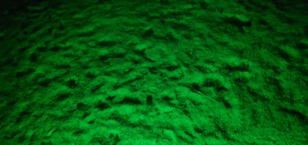 The view of the seafloor from our boat, lit by the green light Jeff puts down to attract fish. No fish showed up for this pic. Looks like Mars, maybe, doesn’t it? The water is about 4 feet deep here and looks like 4 inches.