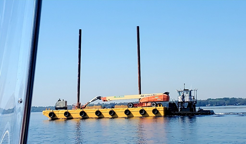 It took us 7 hours to travel 50 miles today because the incoming tide slowed us. We expected that. We also knew about the 5-foot tide at Jacksonville itself, at least 4 feet higher than the tide at last night’s port, and knew the schedule for high and low tides. But we’re still puzzling out how this affects a moving boat on an ongoing basis. It’s sort of like the “the 1s” and “the 2s” on the inland rivers. By the time we truly understood how barge captains communicate, we were nearly done with the rivers! Seems like it shouldn’t be confusing, but somehow it is. So we continue to learn…