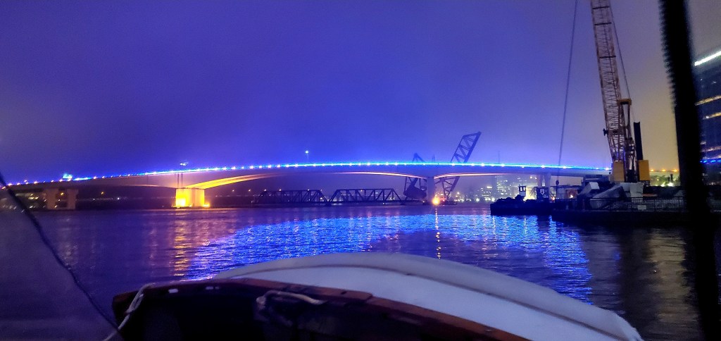 I was looking forward to seeing this city, home to some major Navy installations. I drove through it at night on my way down to the boat a few weeks ago, and it looked captivating with the river and lit-up bridges. And it is captivating…at night. In daytime, not so much. Oh, it’s clean, and “nice”…but, well, it’s a big city. Concrete. Construction. Noise. I almost forget that I lived happily in one for decades. (And still do, half the year.) Have you noticed how one’s impression of a city can vary from daytime to nighttime? That’s one reason I drive my guests around at night when they visit me in Washington D.C. Night-time is so much more magical.