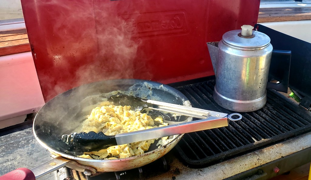 We were under way by 0700 and hungry by 0800. Since seas were calm, I made breakfast on the old propane-fueled Coleman Stove that we keep on the stern. Eggs with sausage, mushrooms and cheese….