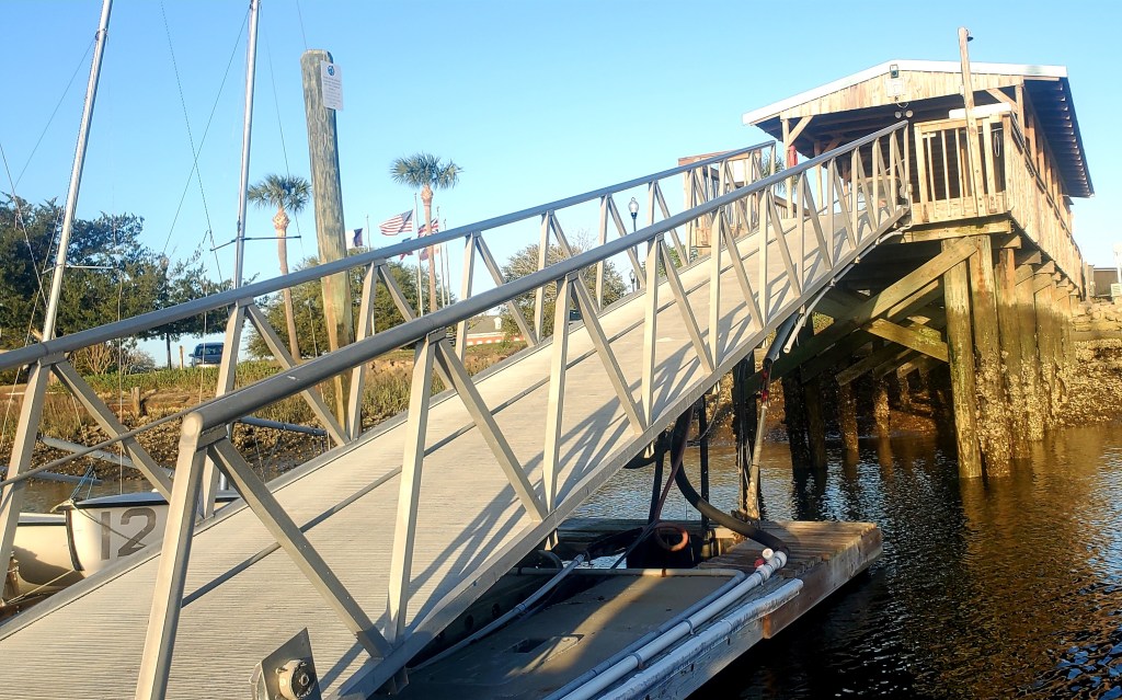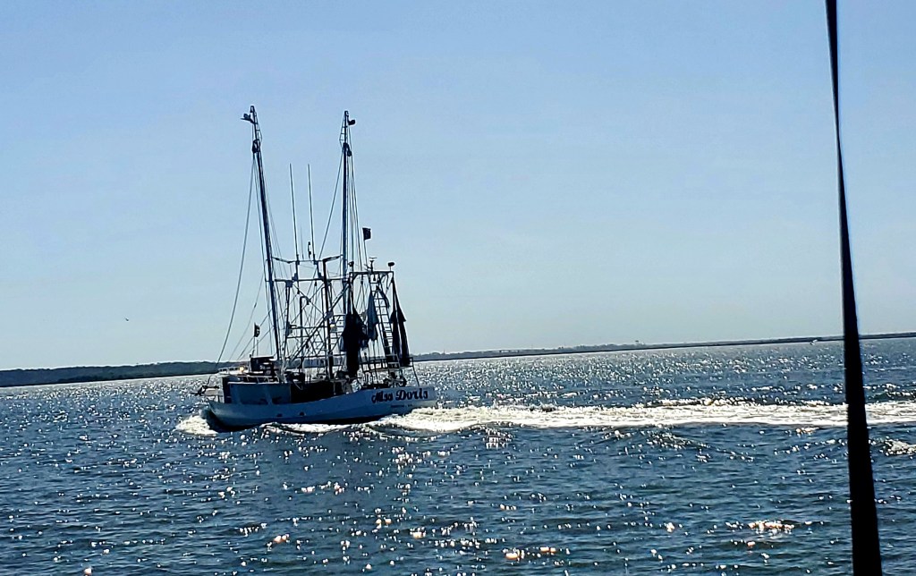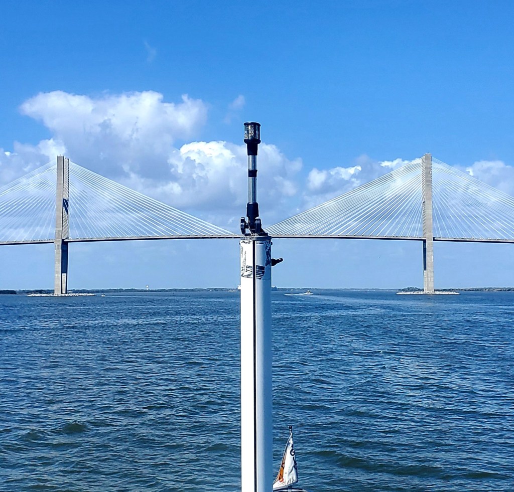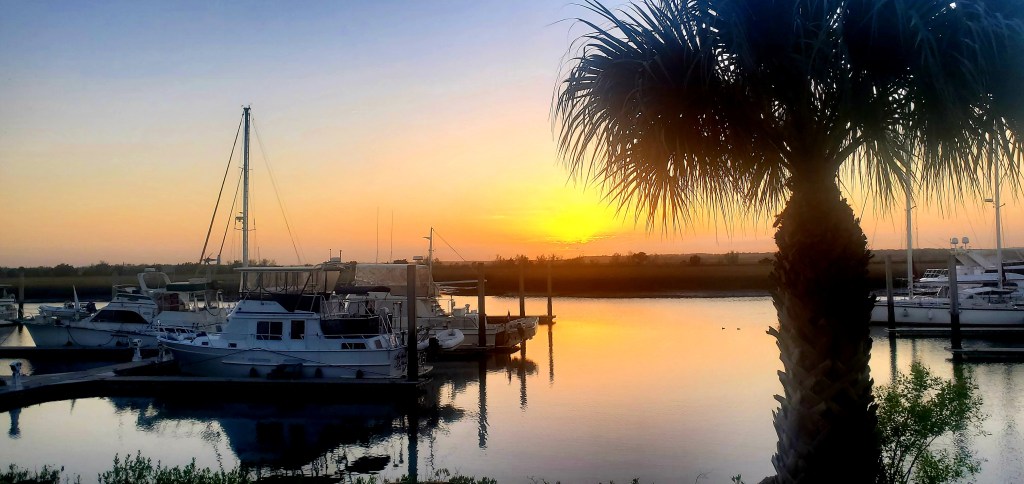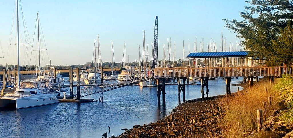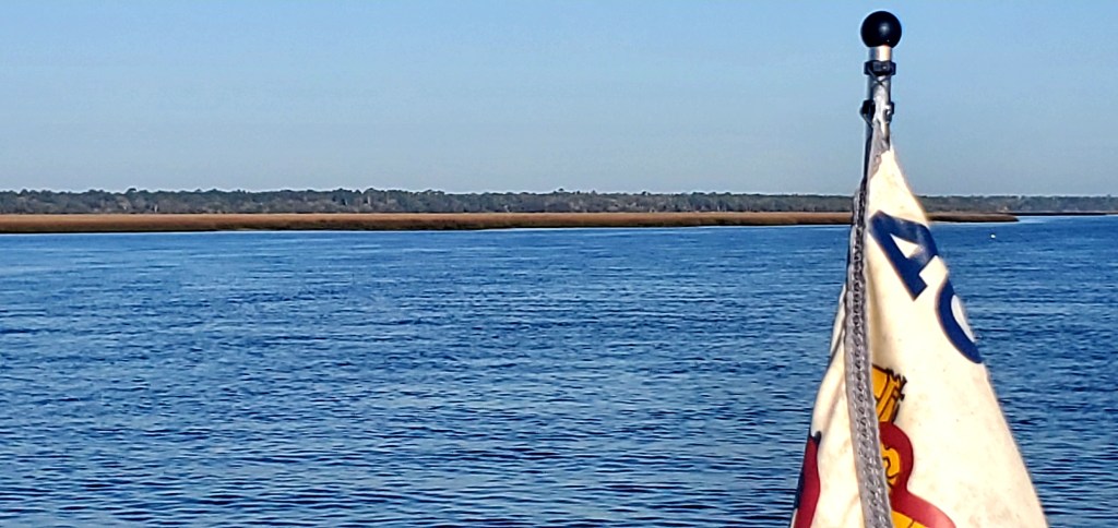 We pulled anchor at 0700 – actually, two anchors, for extra security in tidal waters — for the 37-mile trek to Brunswick, getting an early start to avoid afternoon winds. It was a beautiful cruise through salt marshes, and very relaxing, except for crossing St. Andrews Sound. Rock-and-roll! If it went on much longer, we would have needed dramamine.