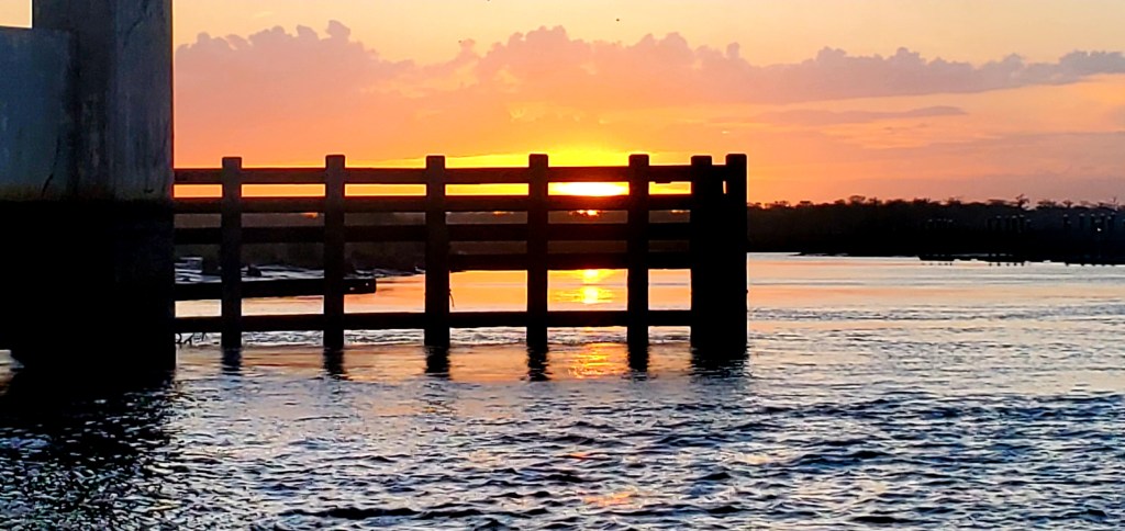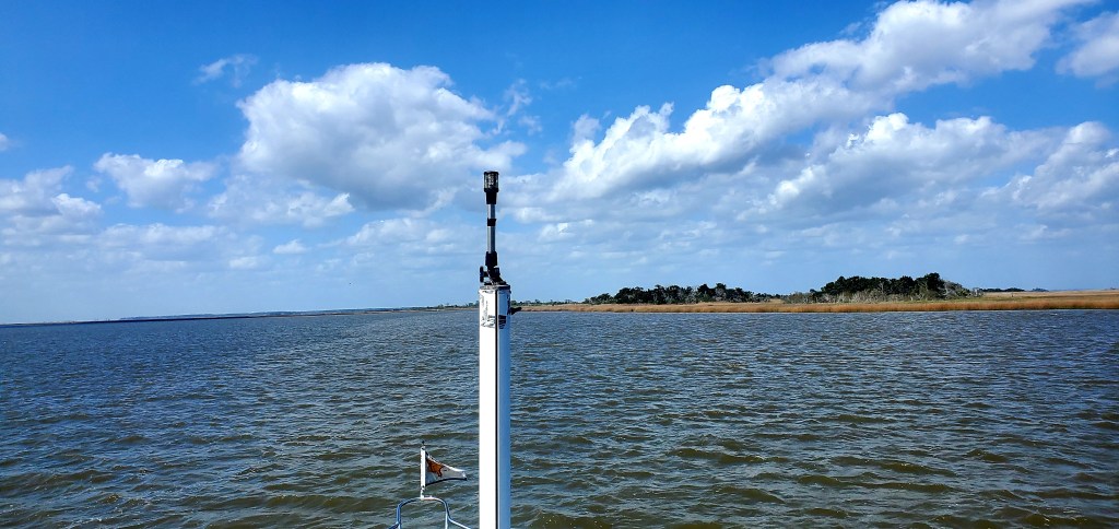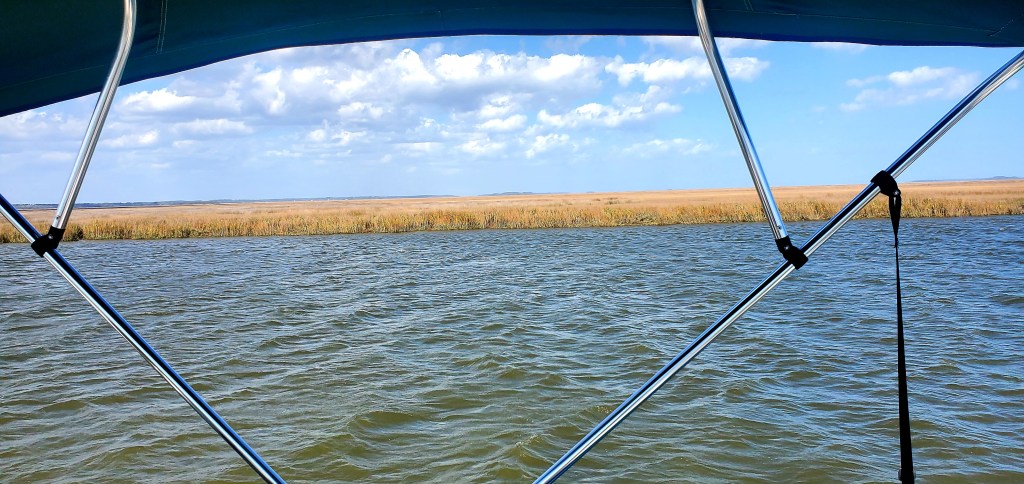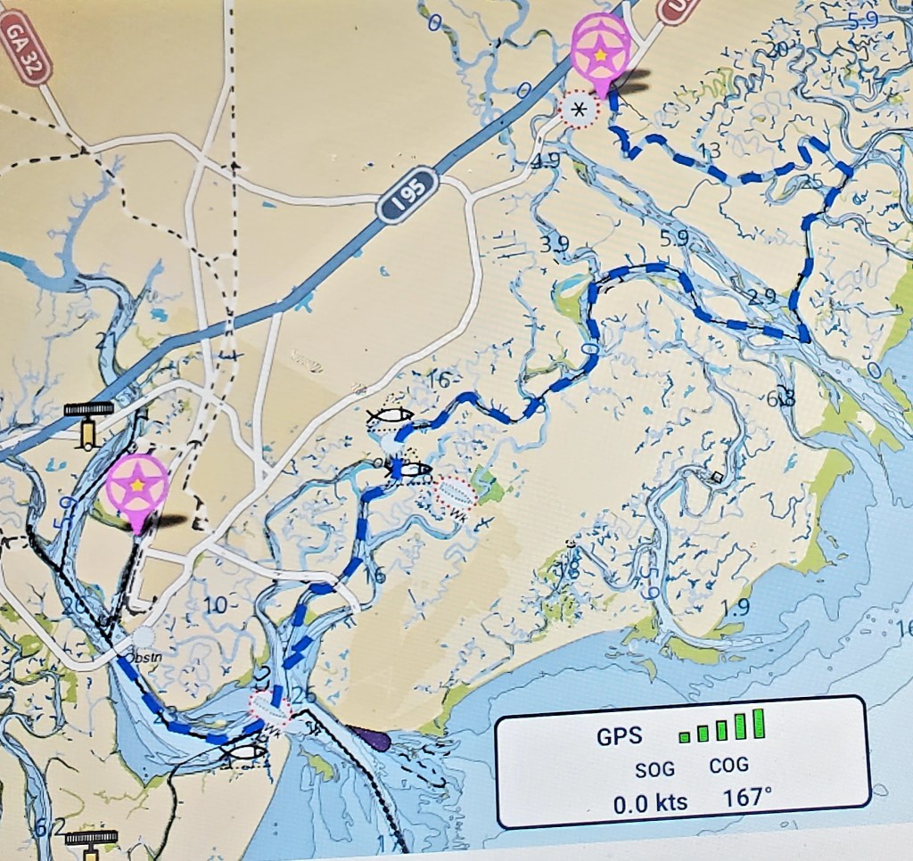 After our 42-mile trek from Brunswick through mostly calm seas, arrival here was exciting. And we knew it would be, based on the wind forecast and our evolving understanding of tides. We didn’t leave as early as planned, so arrived in the midst of strong afternoon winds, with gusts of 25 mph, and a strong current. We had reserved an outside slip so the winds would help us, but another boat had pulled into that spot just before we arrived. Her crew was busy trying to tie up, and we couldn’t exactly kick them off – although the dock owner briefly tried to do so. “Never mind,” I called out to her. “We’ll figure it out!” Jeff maneuvered the boat into a swirl of currents between two stanchions of the nearby bridge, gunning the throttle to avoid hitting one of them, and came around to try again. The head-sets that we use to communicate during docking and anchoring weren’t working, so that didn’t help much as Jeff navigated the boat to an inside slip and I jumped off to the dock – never a good idea – to get a line around a cleat and pull us in against the wind. (We did call ahead to get help with the lines, but she wasn’t strong enough to pull us in alone given conditions.) Ah, well. Excitement and surprises are part of cruising to unfamiliar places. I admit I prefer to get my excitement in other ways!