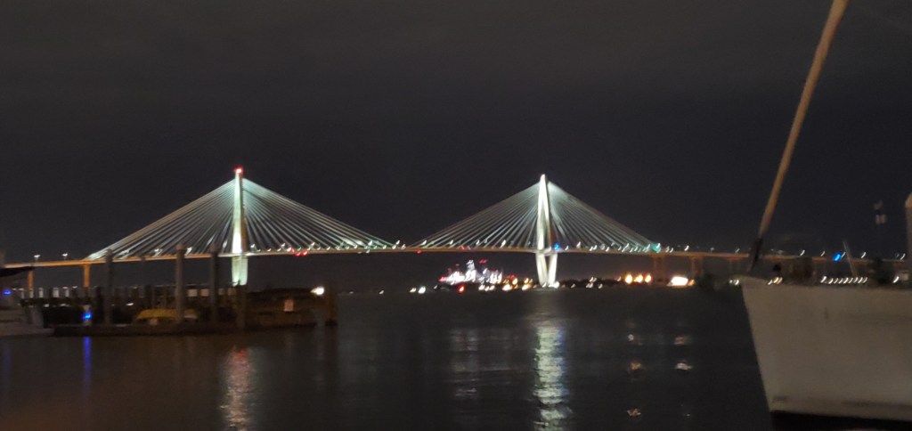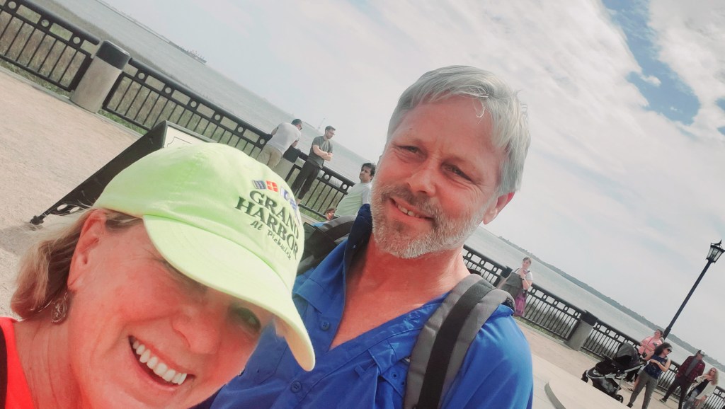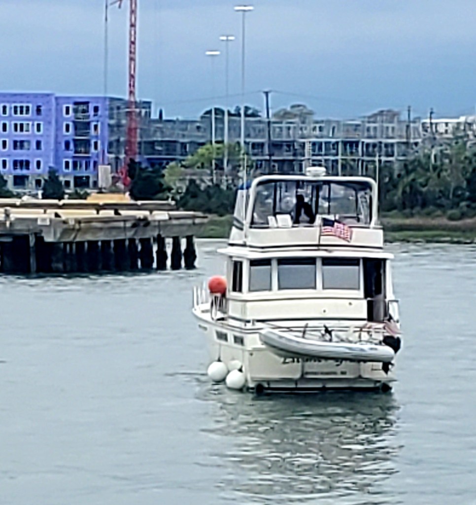 But we will remember Charleston most for the gusty winds and large ships that passed near our small marina, rocking Many Moons continually and keeping us here a 2nd night. (Nothing to complain about!) I will also remember it for the way we got here. We took a wrong turn and left the ICW (Intracoastal Waterway). I hasten to add that Jeff was driving when this happened. ๐ I did give him some hints. “Jeff? We lost the Mile Markers. Have we left the ICW?” Five minutes later: “Jeff! How did Boomerang (a Looper boat that we were following for hours) end up behind us? Have we left the ICW??”
