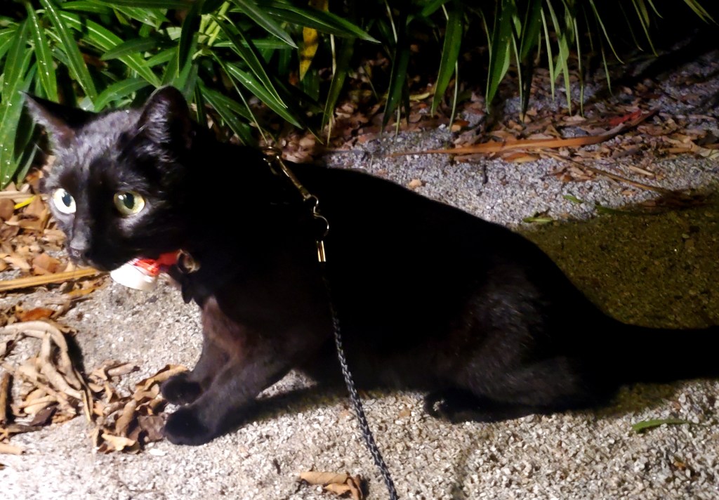 Boo was a little alarmed by the city noises during her evening walk – on a leash.