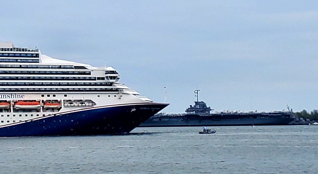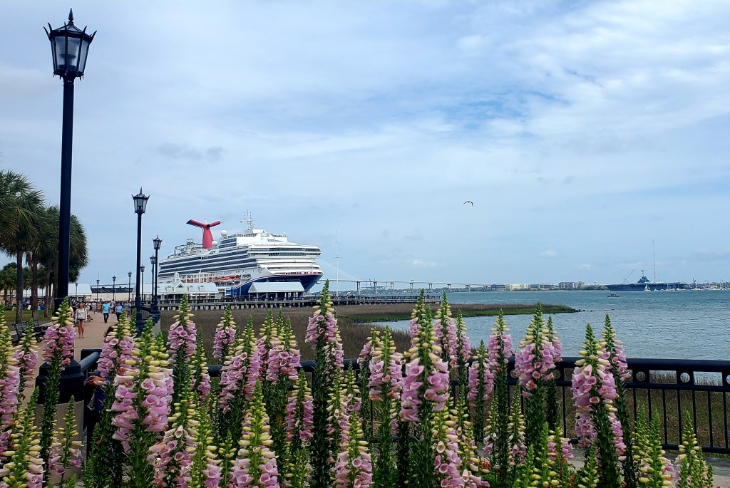 The USS Yorktown aircraft carrier/museum is behind the departing cruise ship.