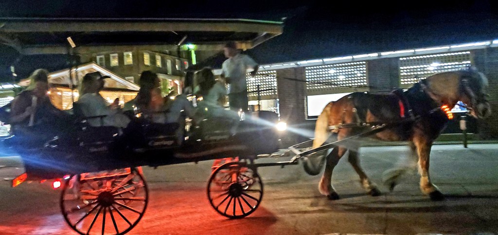 The horse-drawn carriages work late. You can’t see the Harley motorcycles just in front of the horses.