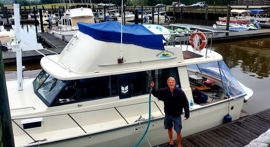 Sitting at a gusty but private anchorage tonight near the town of Swansboro, N.C., it all seems so improbable. On July 30 last year, the Mainship Many Moons left Keweenaw Bay in Michigan’s Upper Peninsula to start The Great Loop, not knowing how far we would get. Along the way, we’ve learned that we are smaller, slower, older, and less “equipped” than the average Looping boat. Along the way, I left the boat for three months and Jeff stayed put for about two. Now here we are, more than 4,000 under-way miles later, on Day #238 and Stop #105 — well “ahead of the pack” of Loopers lingering south of us as they await warmer weather to the north.