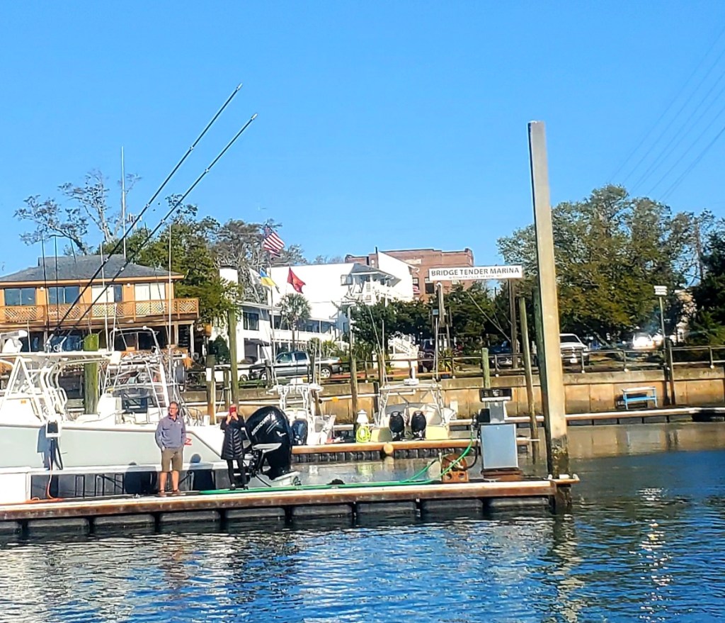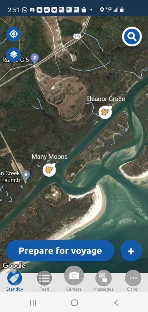 At Onslow Beach Bridge, Eleanor Grace caught up to and passed us. We reconnected with them in Beaufort S.C. nine days ago. We saw them pull into Barefoot as we pulled out. Then we saw them pull into Southport as we pulled out. We’ve been about 10 miles ahead of them and keeping an eye on them.