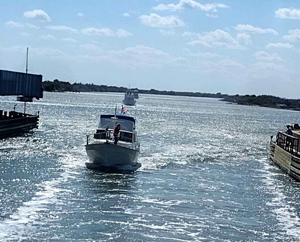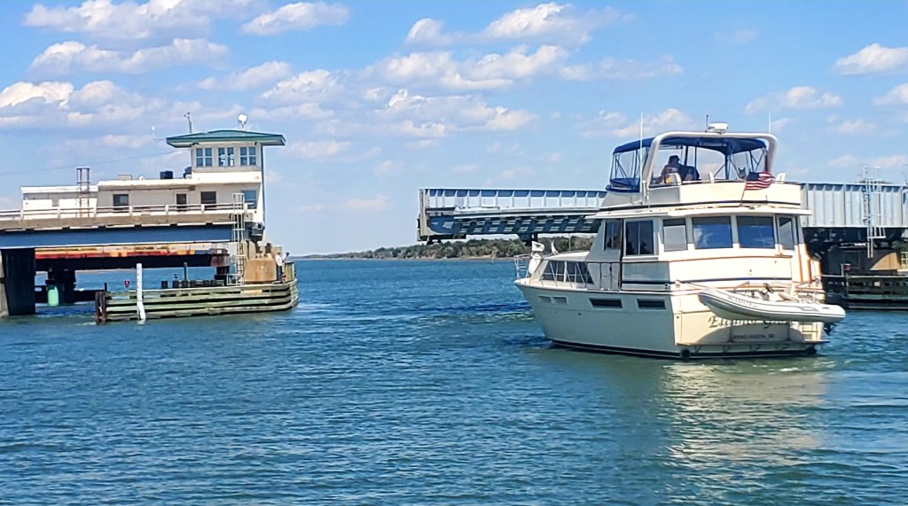 Marcy on Eleanor Grace took this photo of us as we passed through the bridge behind them. You can just make out three more boats behind us. Many bridges on the intracoastal open on a schedule, and boats go through in a parade. We waited 20 minutes for this one to open.