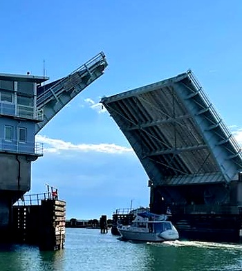 They took this pic of us passing under this bridge as it began to close. It had opened for a boat in front of us, but Jeff told the bridge tender it could close as we passed under. We are only 14 feet tall and know the height of bridges before we approach them.