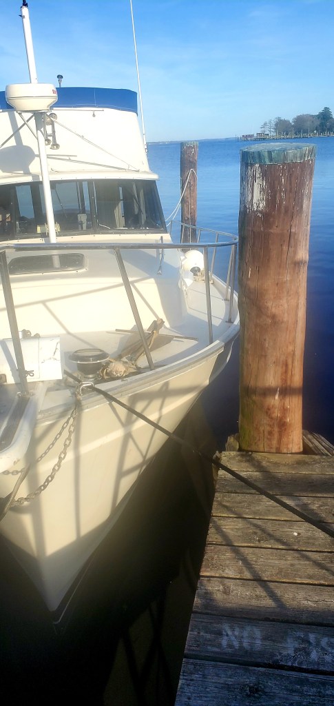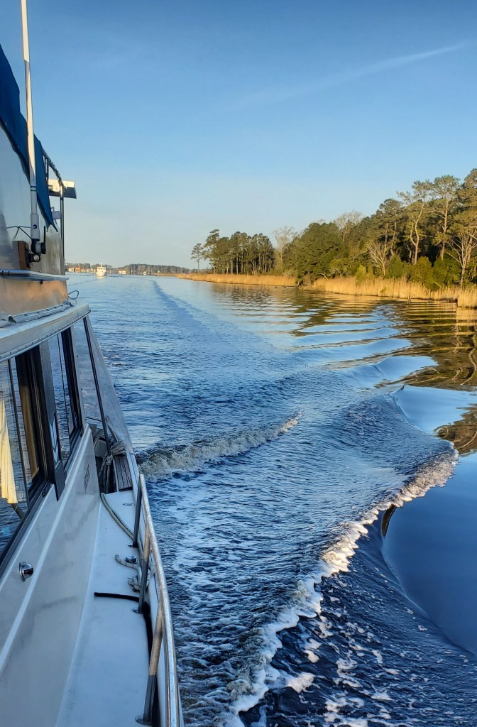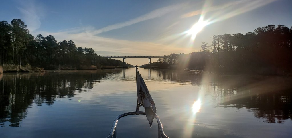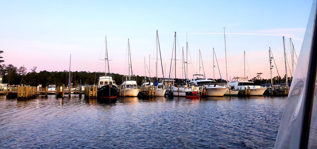 Are we ever glad to be tied up tonight to a tiny pier in Elizabeth City at the entrance to the Great Dismal Swamp. We should celebrate this milestone, but we’re too tired after 10 hours under way.