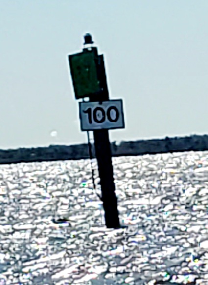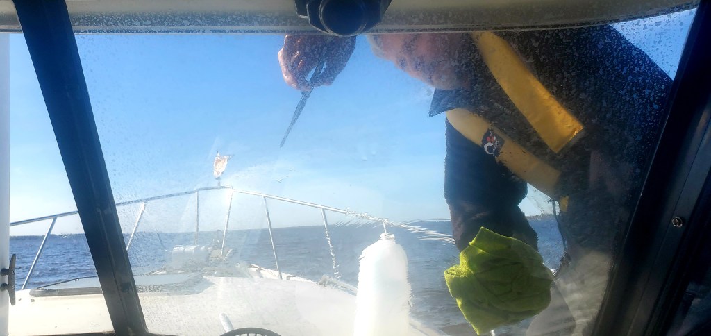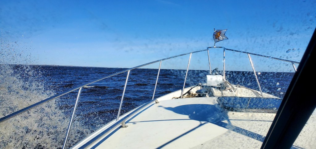 Last night was a cold one, just below 30 degrees, but our diesel heater kept us warm. Even Boo the Cat squished next to me in the narrow V-berth rather than in her cat bed in the salon. We were under way by 0700 to give us the best chance for the long cruise we aimed for but didn’t necessarily expect. It started out great, in the calm of a straight canal, where a parade of boats passed each other with exquisite politeness. That calm didn’t last long. Neither did the politeness. Within four hours, we were back in the whitecaps, using windshield wipers, with waves over the bow…and one extraordinarily rude driver who got his comeuppance. The story in photos and captions, below.