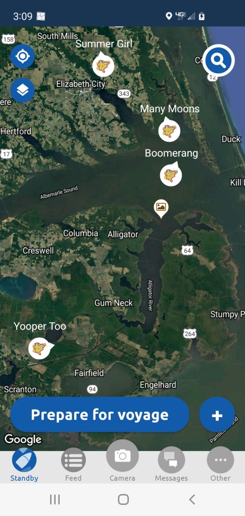 Only two day cruises during Many Moons’ eight-month journey were longer than this one, and not by much. We made 156 miles in the last two days and a lot of them were rough. Why push it like this? To make it through the famed/feared/shallow Albemarle Sound during manageable winds. We hear that some boats wait as long as a week for favorable winds. I wouldn’t say our winds were favorable, exactly — but they were manageable. I never doubted the boat’s integrity, or our ability to stick it out. Nobody got sick (dramamine helped, again) though we did get weary.