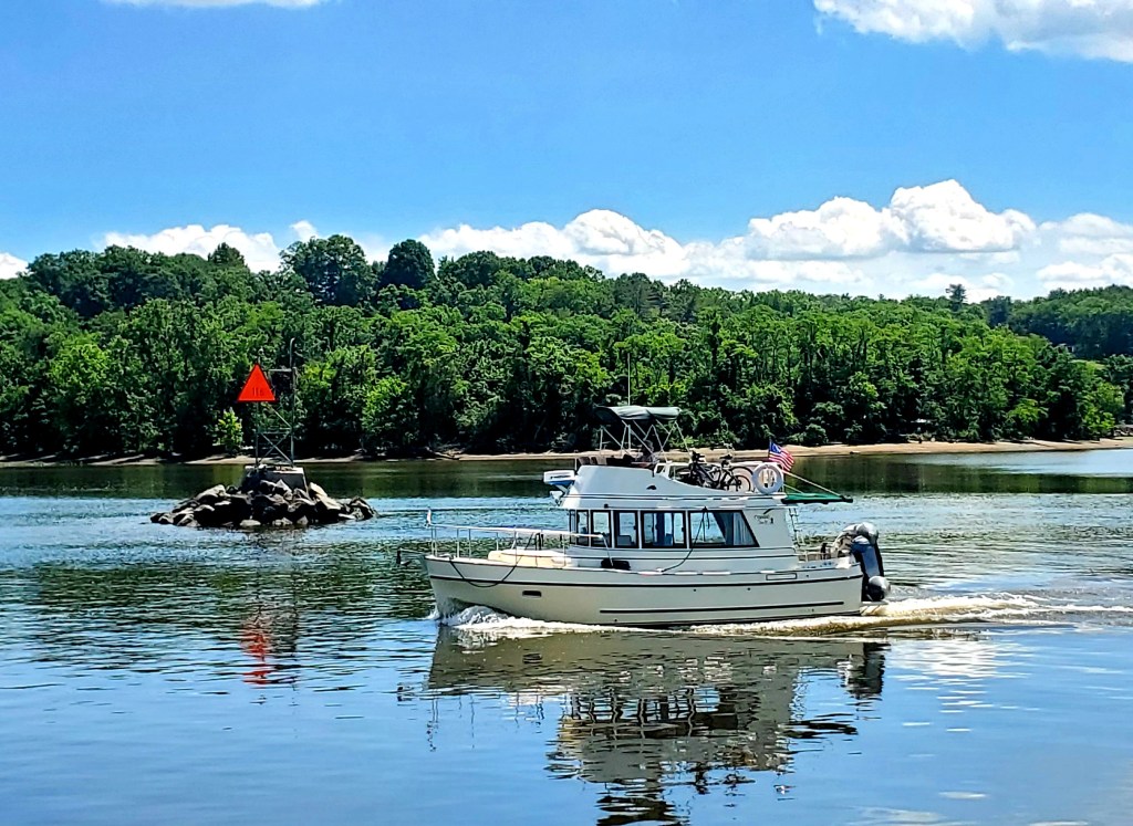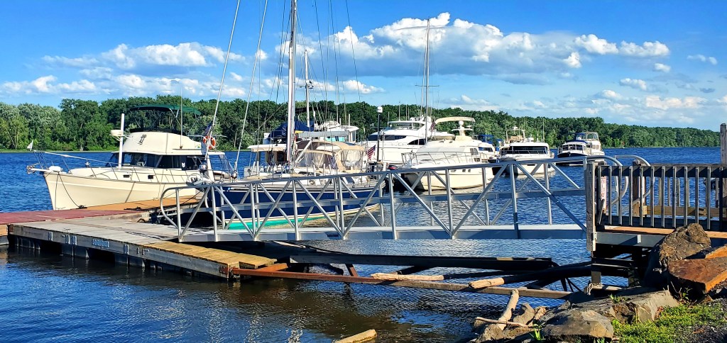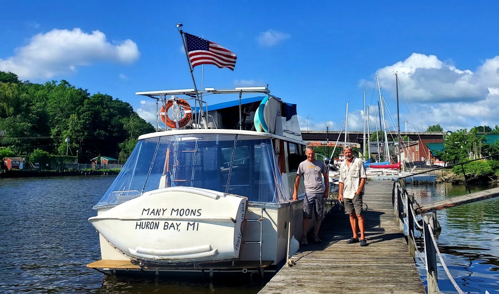 Many Moons dockside at Shady Harbor Marina, New Baltimore (N.Y.) The water is calm here, but the wind picked up just as we arrived and pushed us away from the dock. I was glad for dockhand help. (This boat has one engine and no thruster, which is unusual on The Loop and makes docking trickier. Jeff prides himself in his “old-school” approach, and I respect him for it, but it does make my job trickier too.)