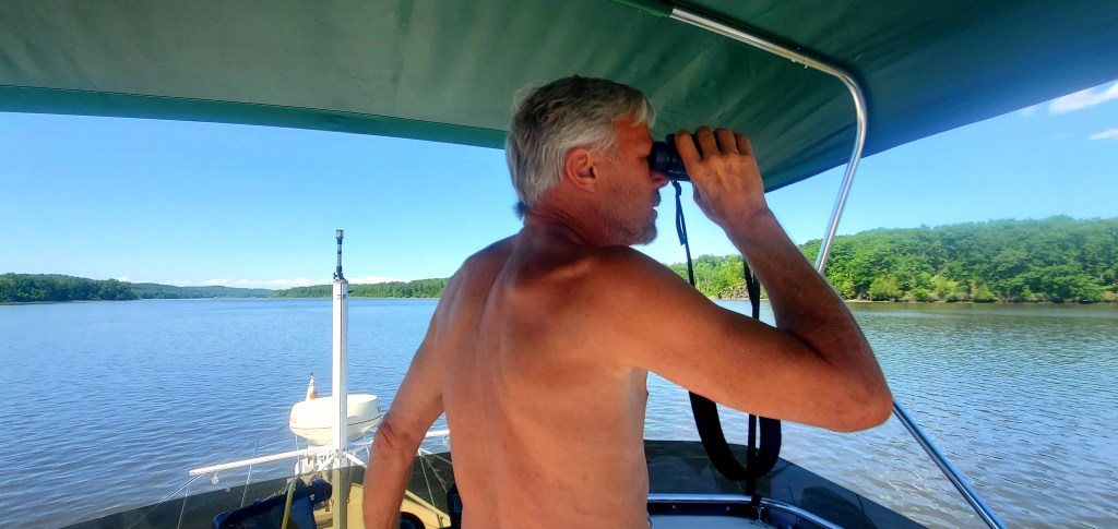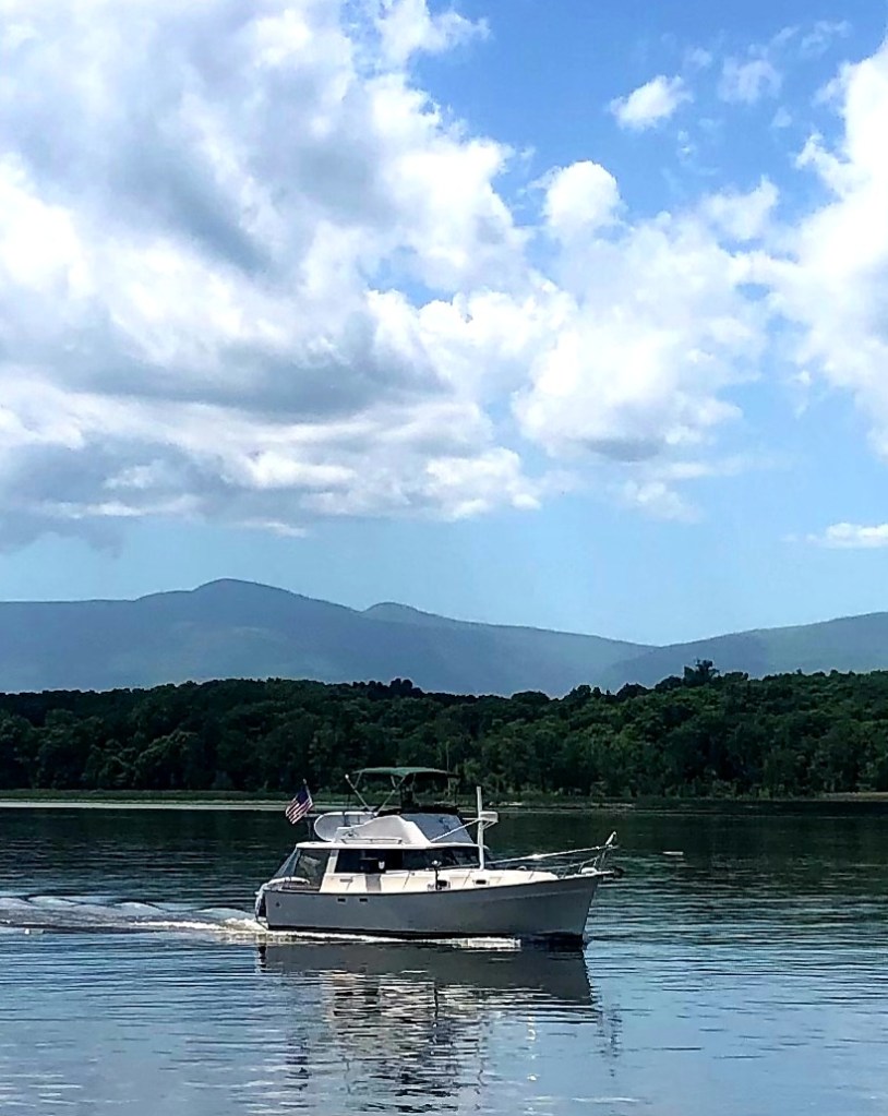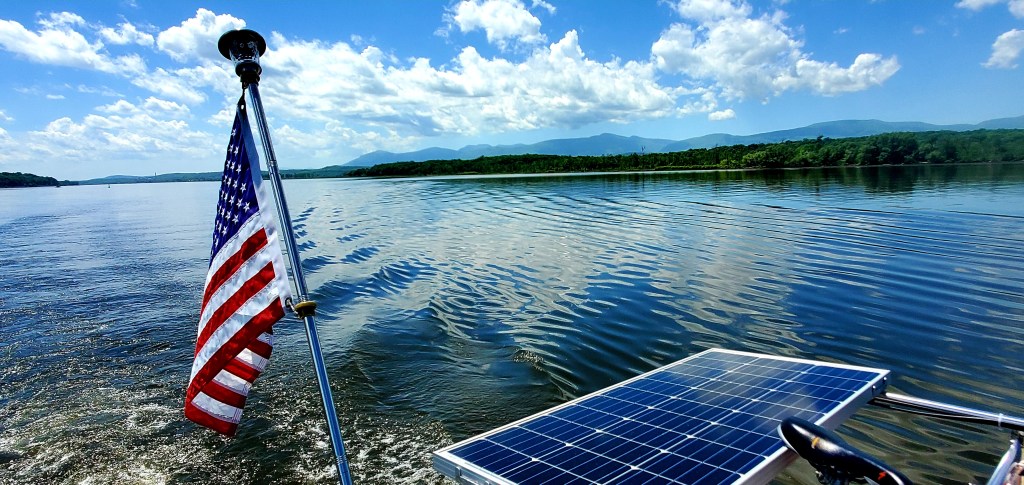 Sunrise comes early on the Hudson in June — and we are fortunate to have so much sun these days. It does require adjustment. (Indeed, underway life requires various biological adjustments–and emotional ones, too.) The sun rises now at 5:19 a.m. here in upper New York State. So it is that this Looper, who prefers to write at night when it’s quiet and wake when my body is ready, gets up by 6 a.m. Jeff always wakes before me and is always eager to move on — so we left Kingston early (by my standards) and headed back into the Hudson. The tide was still against us so our progress was very slow — about 5 mph — for hours. It took nearly eight hours to go 41 miles. But it was a beautiful and relaxing eight hours. Photos and captions of Day 308, below.