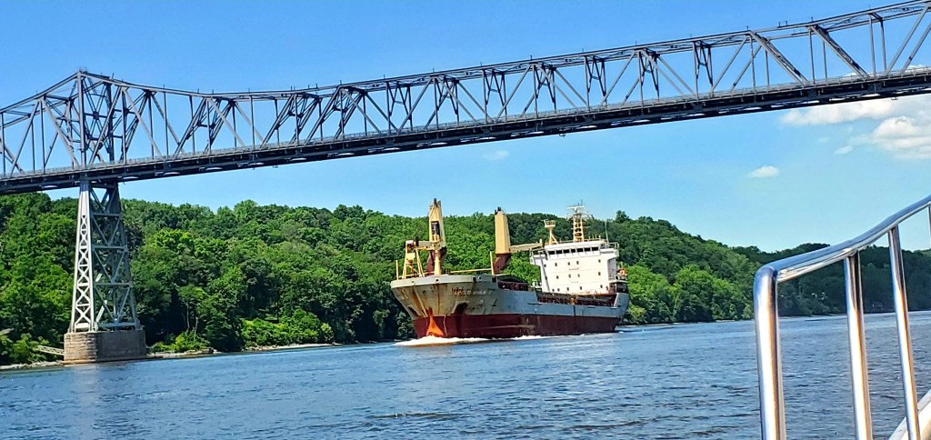 A cargo ship meets us as we approach the Hudson River Skyway (NY23). We know ocean-going vessels come up the Hudson but haven’t seen many.