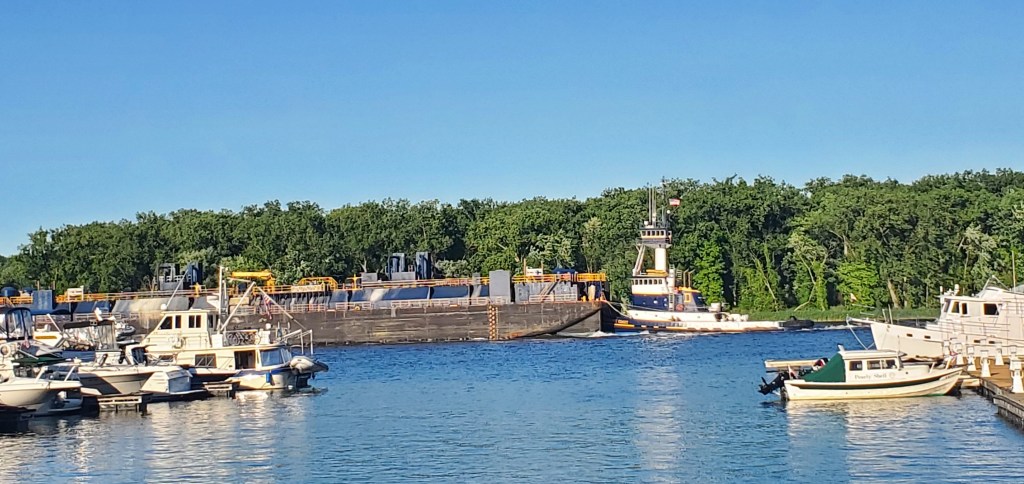 A tug pushed a barge by the marina, highlighting the narrowness of the river here.
