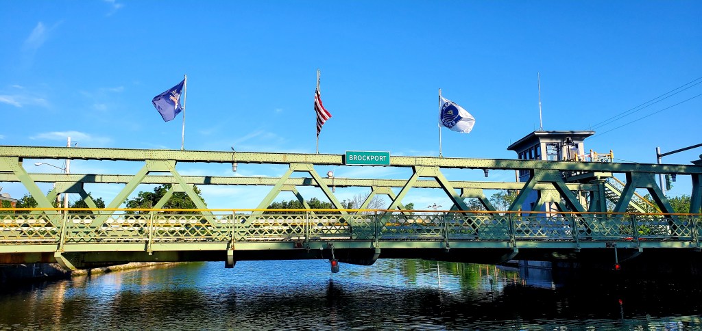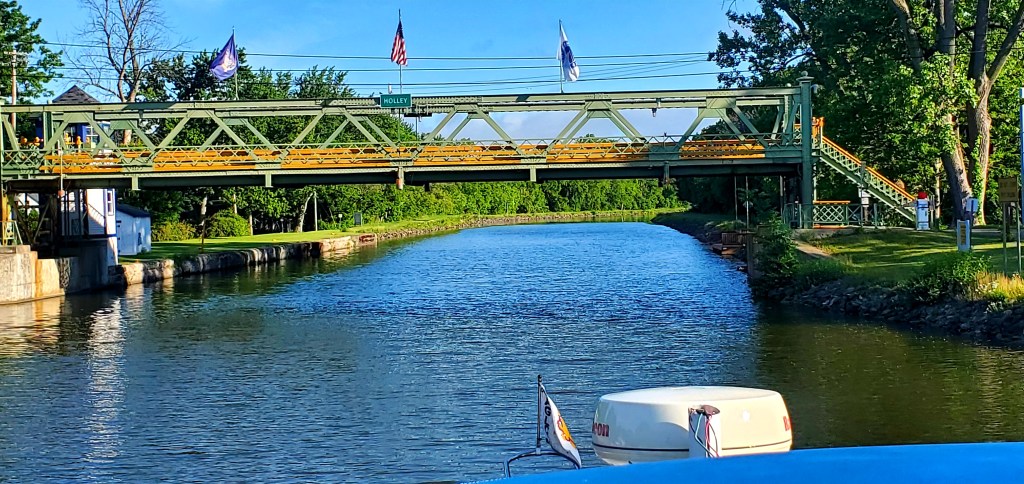 Today was all about the lift bridges on the Erie Canal that had to open for us. (Well, mostly about that.) We left Brockport at 0700, as soon as the lift bridge in front of our nighttime berth began operating, headed for Gasport or Lockport or Tanawanda. Our destination depended on how long it would take to navigate all those bridges, and what kind of stopping places we found. We also faced the last two locks of the Erie Canal and knew that they were pretty big ones.