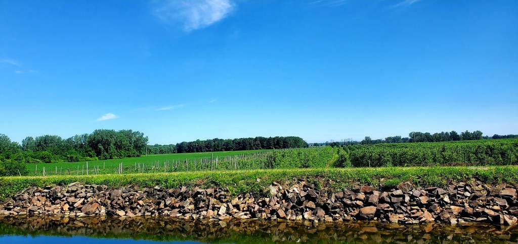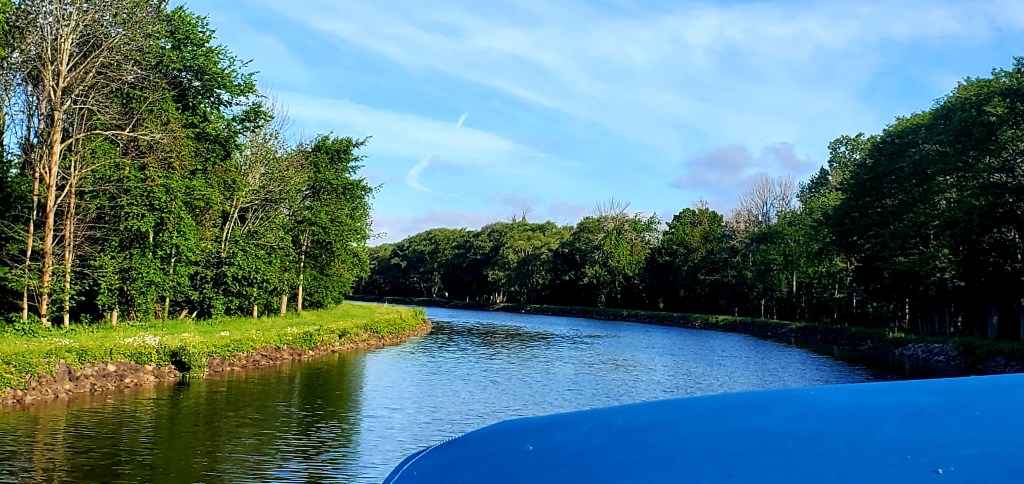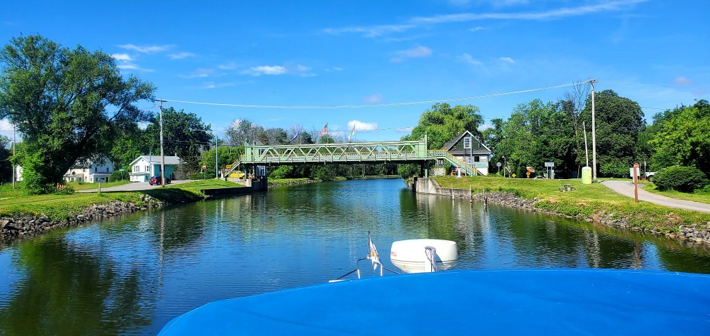 The Erie Canal is narrow and peaceful here. That’s our blue fly bridge cover in the foreground.)