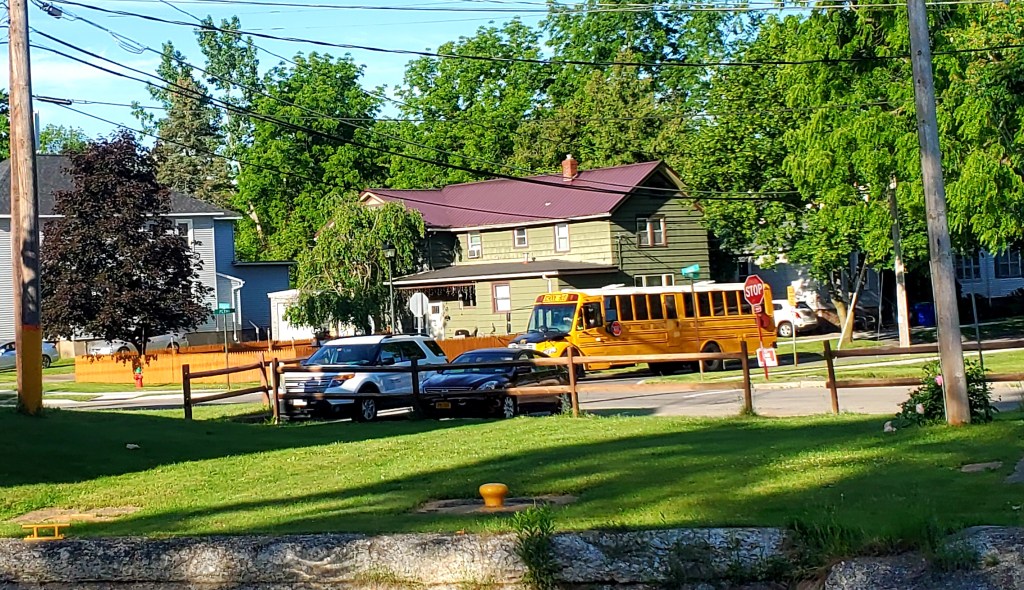 A school bus waits for us to pass. (At the 1st bridge, in Brockton, it was a line of four!)