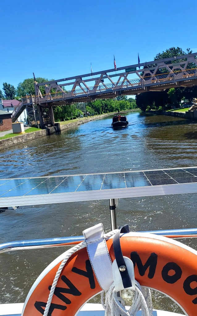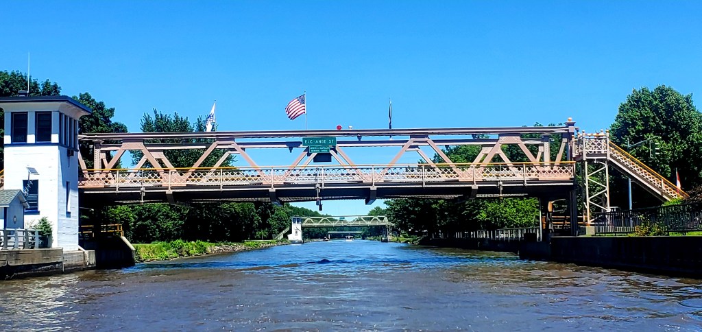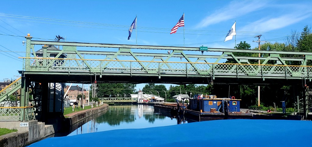 Ingersoll Lift Bridge, with Main St. Lift Bridge (MM292) tight behind it, in Albion N.Y. These were run by the same “roaming operator,” as many canal bridges are, so we had to wait for him to get to the 2nd bridge.