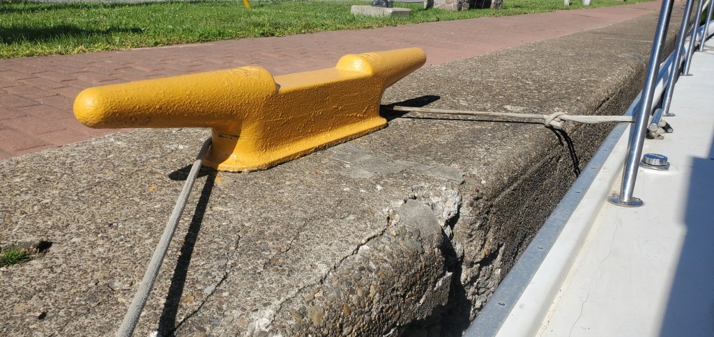 Waiting for the next bridge to open for us, we wrapped a line around this huge cleat to rest easy in place.