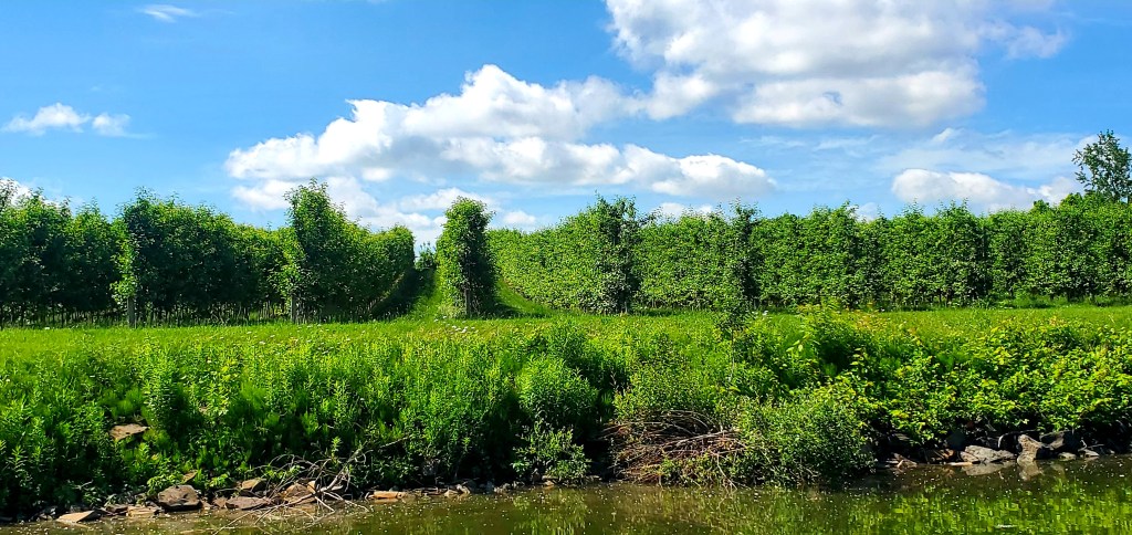 The canal already passed over a road earlier today. Now, near Medina, it crosses over a river! You can barely see the river on the left, beyond the trees.