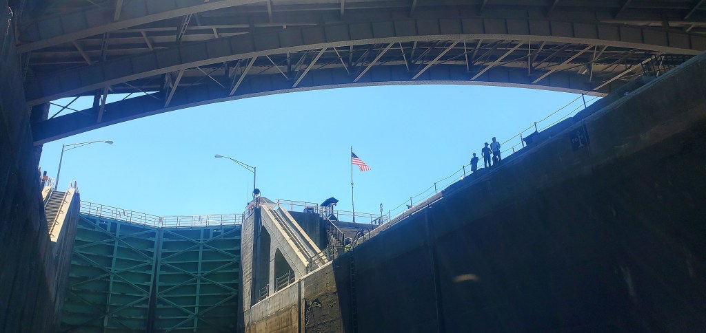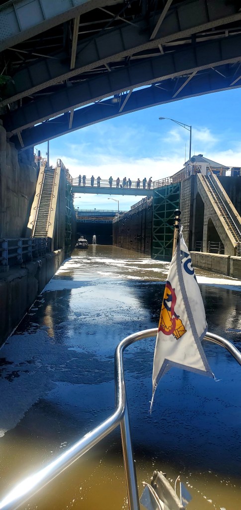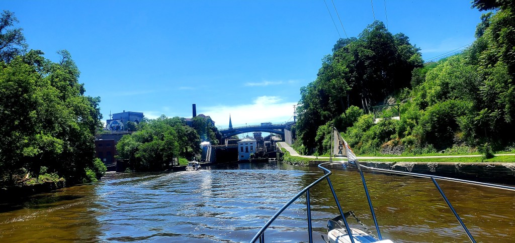 Approaching Lock #34 & #35 at Lockport. These large locks, our last on the Erie Canal, “share a common door.” We don’t understand yet what that means. But we know they are big and very close together.
