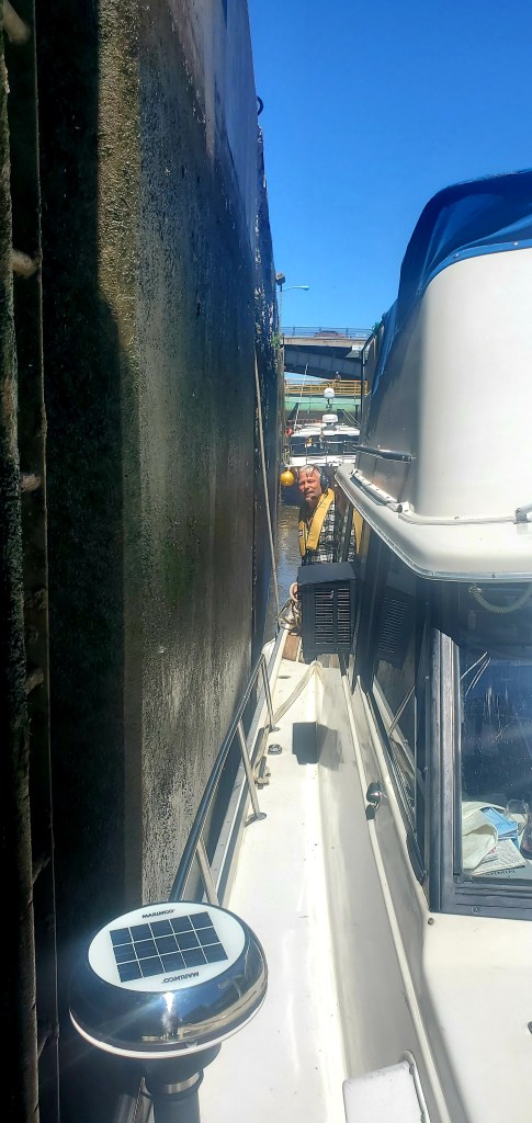 So we tie up on the starboard side instead. Here, Jeff is hanging onto one of the lines. The water swirled pretty strongly in this lock and we both had to hang onto lines to keep from banging into the walls. So, about that other boat that was in the lock already when we entered it….