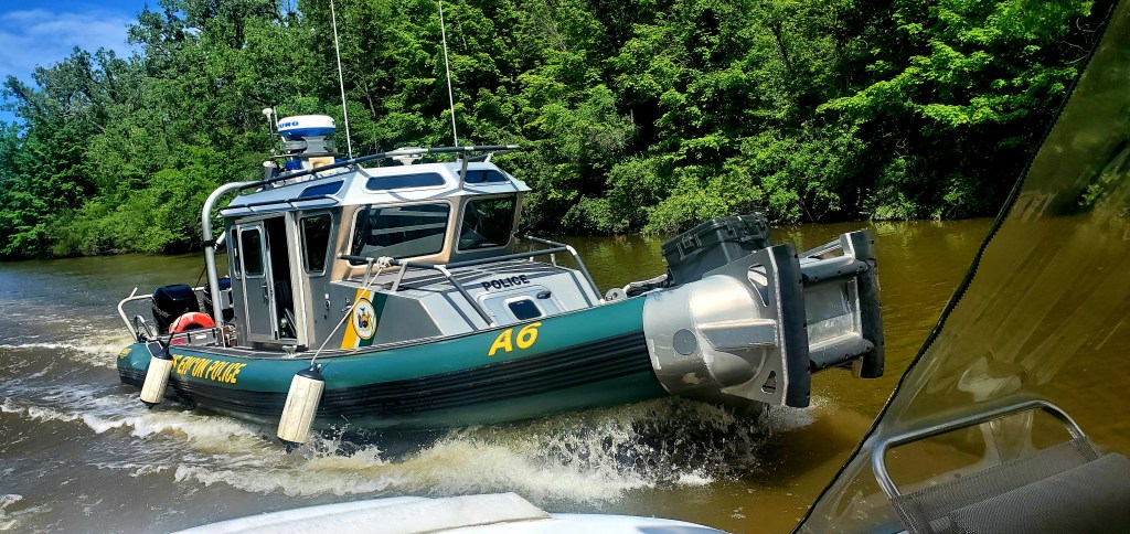 This is it! A law enforcement vessel. Shortly after we left the lock, it turned on its blue light and “pulled us over” for a safety and regulatory check. This happens while both boats continue to move. The Coast Guard vessel matches our speed and when it’s close enough, an officer jumps aboard. Not a big deal for us, since we’ve been through this three times before. (I even drove through the first one and it wasn’t hard.) This was the first time this year, though. We passed the inspection.