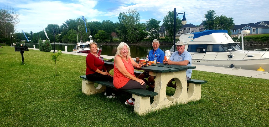 After a day that felt longer than the mileage suggests, we stopped at West Canal Park, a free dock just a few miles before Tanawanda and the end of the canal, to relax with our friends from Rachel Ann. Plus, a big bonus — a visit by Stephanie, a local who is the daughter of a Looper we met months ago. She recently sailed up the East Coast…in the ocean…by herself. You go, girl!!