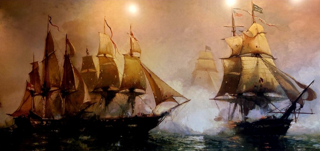 An artist’s depiction of the Battle of Lake Erie. This is where the phrase “Don’t Give Up The Ship” was first popularized, when OHP put it on his flag. You can see (and buy) those flags at many maritime areas today. OHP’s victory forced the Brits to abandon Detroit (I never knew they held it!) and broke Britain’s alliances with Native American tribes.