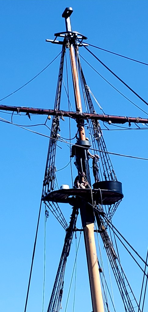 U.S. Brig Niagara is the ship on which Captain Oliver Hazard Perry (OHP) defeated a British squadron during the Battle of Lake Erie in the War of 1812. It was the first time in history that an entire British squadron surrendered, and Great Britain was a Naval superpower at the time. No wonder OHP is still considered a national hero! The Navy had only 17 ships then–plus 165 gun boats. (It probably helped that Great Britain was still/again at war with France.) This reconstructed brig serves as a trainer for students and goes out daily. Here, workers are preparing the capstan for the daily sail.
