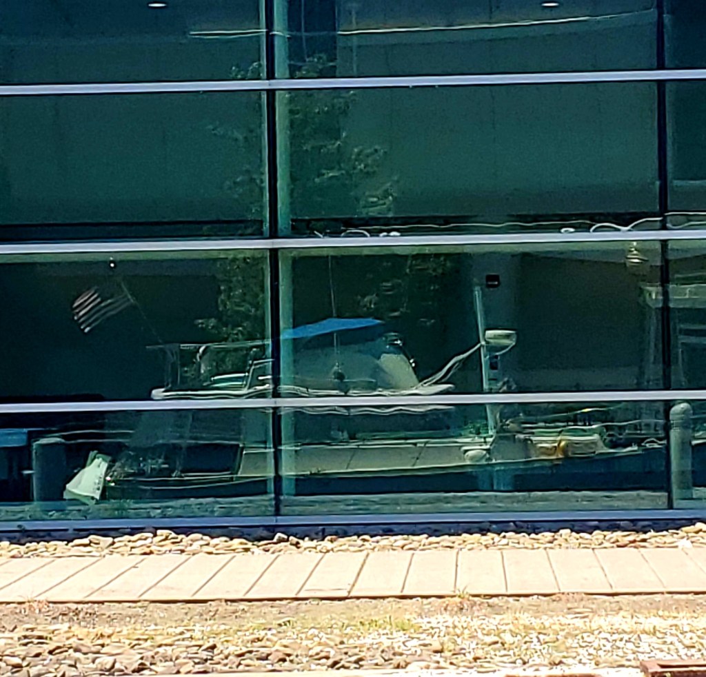 As we left the marina, I got this shot of Many Moons reflected in the convention center’s glass walls.