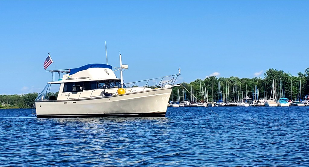 We spent two nights at Wolverine Marina in Erie before moving to an anchorage. We went under that raised-green walkway on the left in order to come in here, and leave.