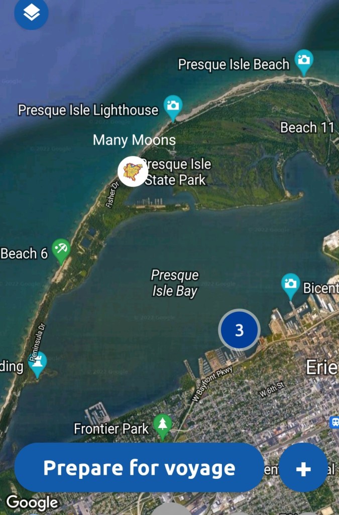 Our anchorage near Presque Isle State Park is peaceful and protected from those strong west winds. We went just 2.5 miles across Presque Isle Bay, from our marina at that light-blue dot, to find this quiet place.