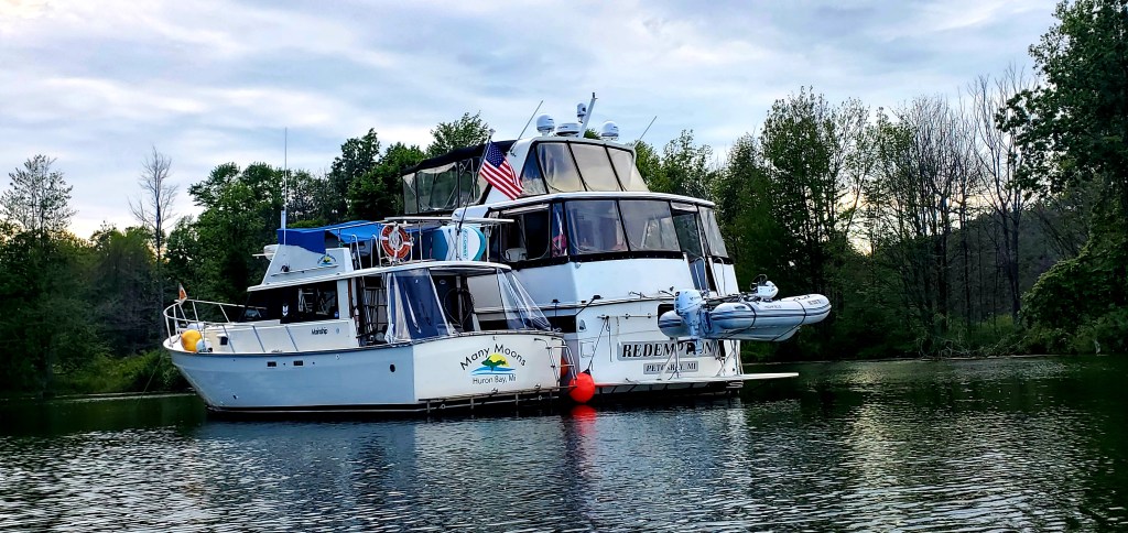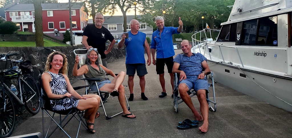 On our 5th night in Erie, Pa., we were joined at anchor by the crew of Redemption. How fun to reconnect with old friends who we met in Michigan long before starting the Loop (including Tom, who made the Gulf crossing with Jeff after I left the boat.) … and also make some new ones. This boat is crewed by two couples who planned the Loop together and got this boat for the purpose. How cool.