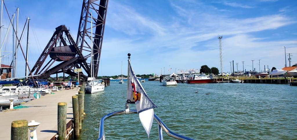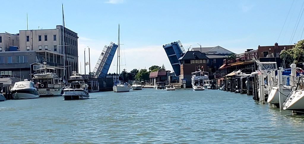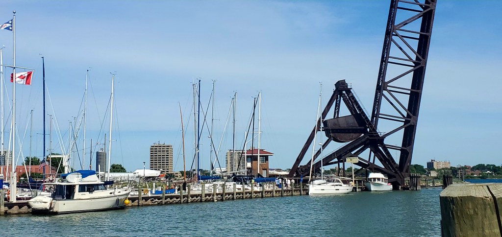 …and, by mid-afternoon, arrived at Port Huron on the St. Clair River/Black River. The narrow Black River is a kind of St. Clair tributary and runs directly through town. Boats using it to enter the St Clair must navigate two low lift bridges.