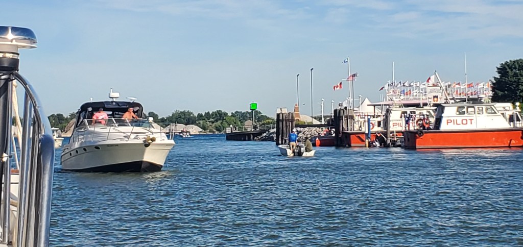 At 6:30 this morning, Many Moons slowed to trolling speed (3 mph) in the St. Clair River as we neared its northern end on the U.S./Canada border in lower Michigan. We had fought its current for 40+ miles already, but this was a whole new level…the most dramatic “current impact” of our 5,600-mile cruise on The Great Loop. Good thing it was short-lived; soon after passing the river entrance and entering Lake Huron, we were back up to 8.5 mph. (For this slow boat, that’s almost speedin’ along.)