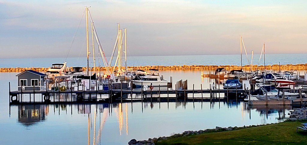 This sinks in as we spend two nights in a well-maintained marina in the small town of Harrisville on Michigan’s east coast, just two days’ cruise from De Tour. It could be a one-day cruise in the right weather, as we’ve done more than 100 miles in a day before — but the “right weather” is hard to come by on Lake Huron these days. (See previous post.) This horse-and-driver have been hurrying for months to get “back to the barn,” but me…I’m in no rush. Soon I’ll be living on land again, trying to figure out what to do with the rest of my life. I can wait a little longer!