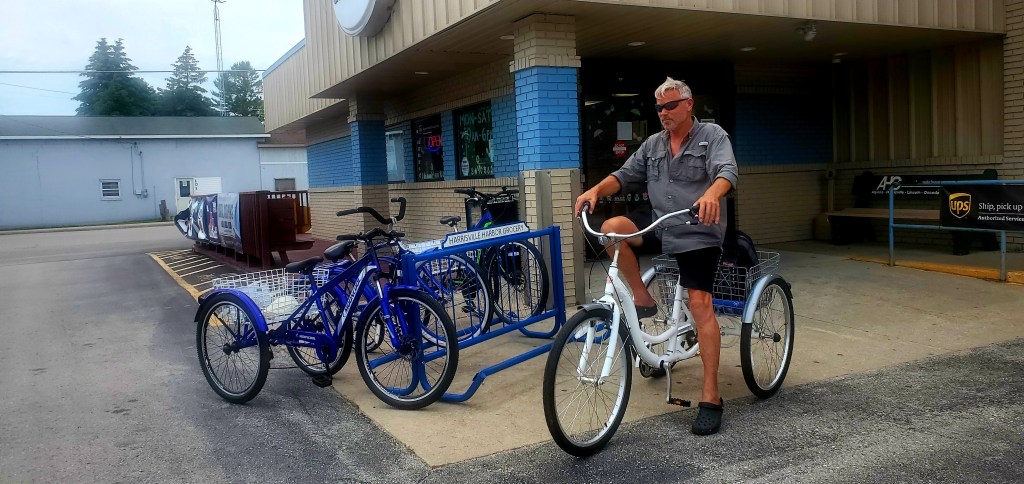 We used the free bikes at this marina rather than our own. They were three-wheelers, with baskets on the back…hard to get used to and amusing to use on narrow sidewalks.