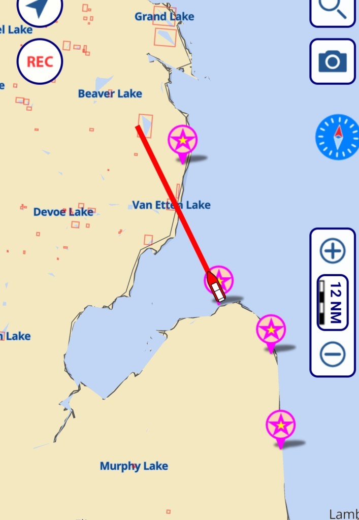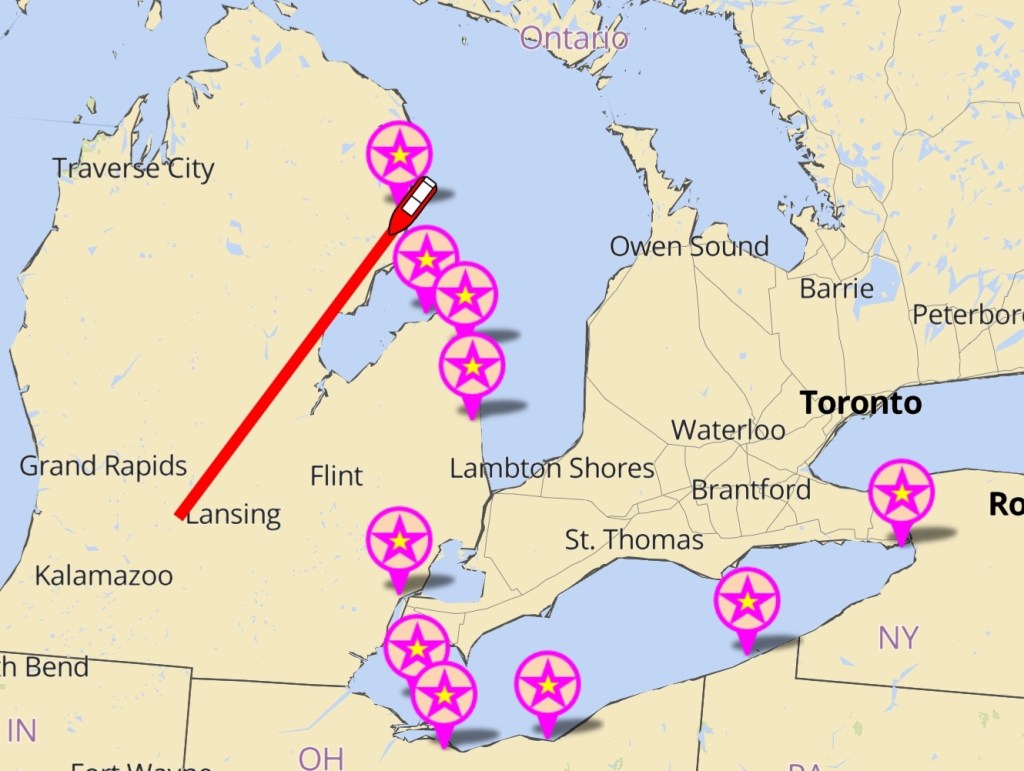 The pink dots show our stops on Lake Erie, the Detroit River, and Lake Huron (so far).