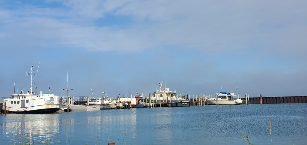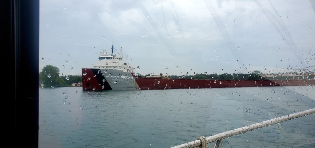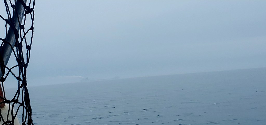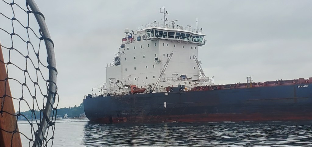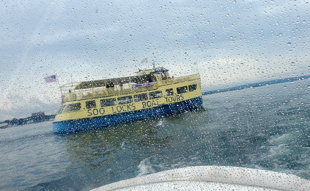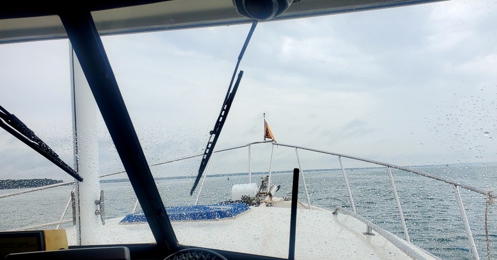 As we entered Whitefish Bay, the clouds dropped low and became fog. I was driving when I noticed, on the FindShip app, that a cargo ship was approaching. (You can just see it through the fog here.) When visibility is bad, my caution meter ramps up so I left the shipping channel. Yeah, it was a wide channel, and Jeff thinks I’m too cautious. Maybe. But didn’t two Navy ships manage to collide in open seas not long ago?