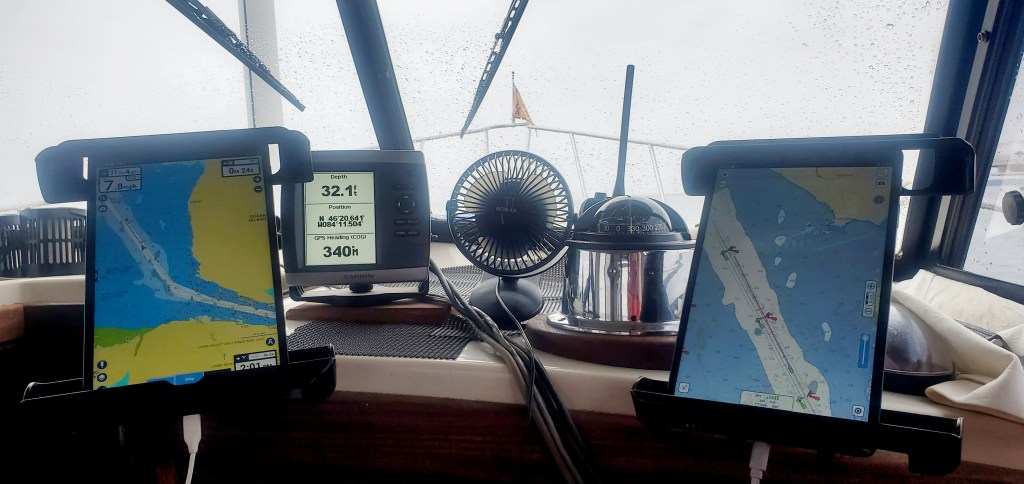 The view of the dash while driving…two tablets and the Garmin, plus the trusty compass. I prefer to use the compass when landmarks aren’t available and visibility is bad. Maybe it’s my old Navy training and maybe it’s my boating roots in sailing.