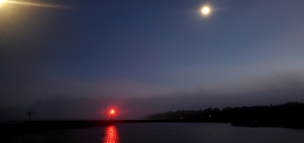 The harbor light and the rising moon are both visible as the fog starts to lift at 10:30 p.m. at Whitefish Point. On upper left, our solar-powered light on top of the flagpole is throwing light onto the photo
