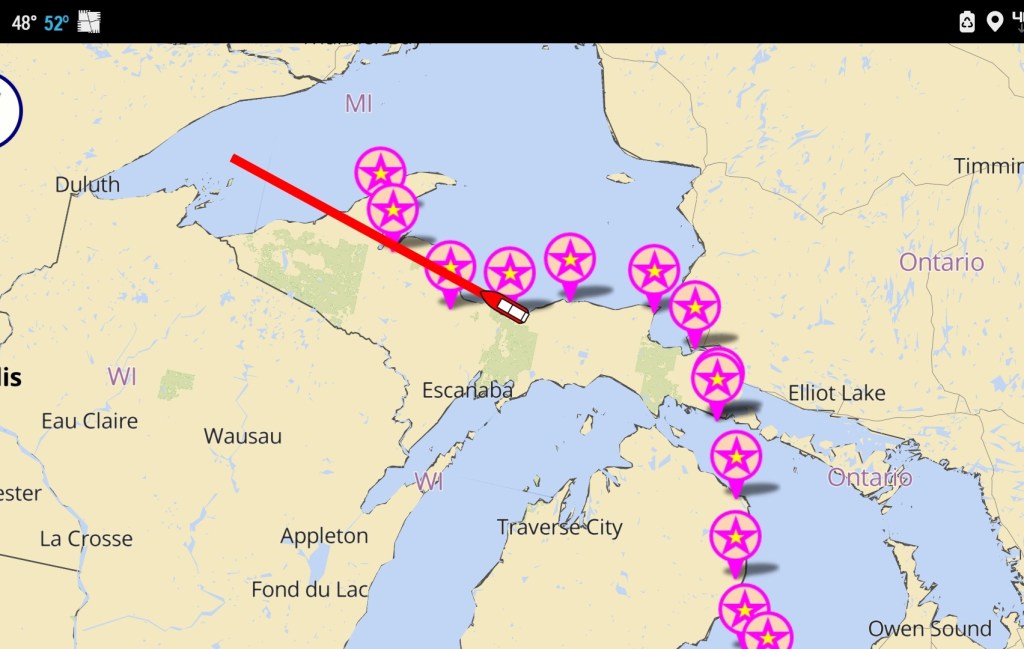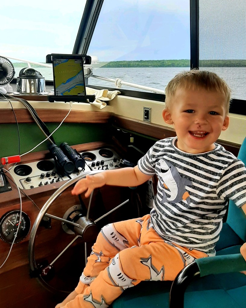 After 345 days under way, Mainship Many Moons returned today to her homeport of Huron Bay in Michigan’s Upper Peninsula with Jeff’s son Josh and grandson Jaxtyn on board for the final leg. It was a big family event and milestone for the three of them. Congrats to three generations!